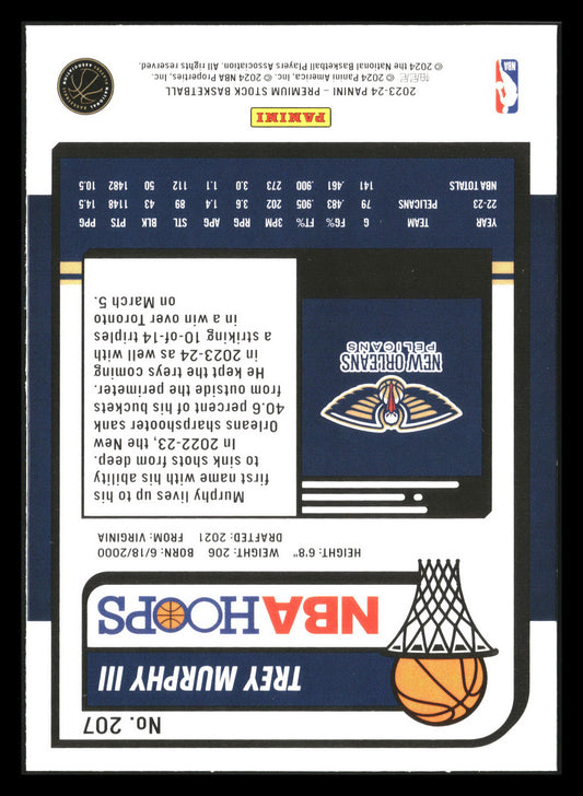 This is a nice example of a 2023-24 Hoops Premium Stock #207 Trey Murphy III Other important information about this card:In 2023 Trey Murphy III played for the New Orleans...