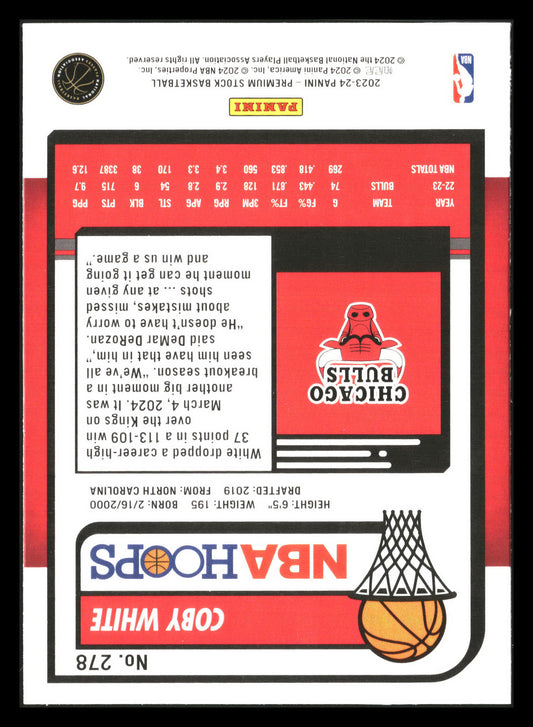 This is a nice example of a 2023-24 Hoops Premium Stock #278 Coby White Other important information about this card:In 2023 Coby White played for the Chicago Bulls.Please check out...