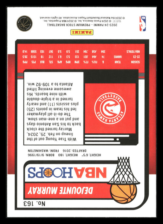 This is a nice example of a 2023-24 Hoops Premium Stock #163 Dejounte Murray Other important information about this card:In 2023 Dejounte Murray played for the Atlanta Hawks.Please check out...