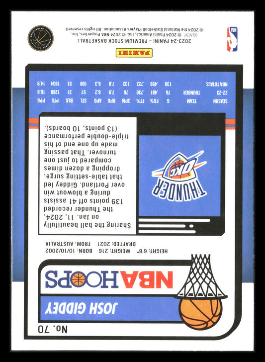 This is a nice example of a 2023-24 Hoops Premium Stock #70 Josh Giddey Other important information about this card:In 2023 Josh Giddey played for the Oklahoma City Thunder.Please check...