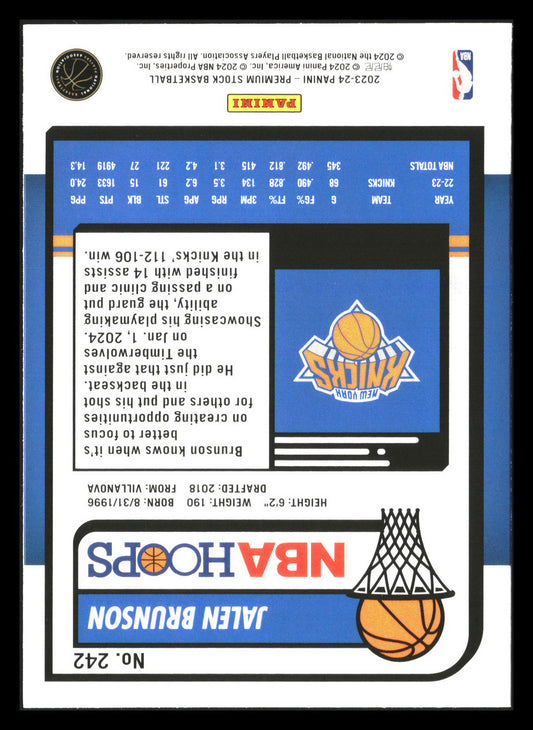 This is a nice example of a 2023-24 Hoops Premium Stock #242 Jalen Brunson Other important information about this card:In 2023 Jalen Brunson played for the New York Knicks.Please check...