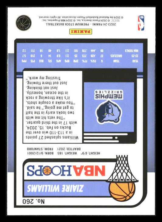 This is a nice example of a 2023-24 Hoops Premium Stock #260 Ziaire Williams Other important information about this card:In 2023 Ziaire Williams played for the Memphis Grizzlies.Please check out...