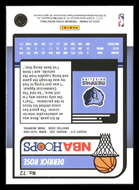 This is a nice example of a 2023-24 Hoops Premium Stock #72 Derrick Rose Other important information about this card:In 2023 Derrick Rose played for the Memphis Grizzlies.Please check out...