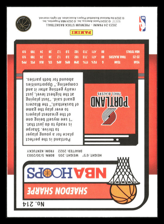 This is a nice example of a 2023-24 Hoops Premium Stock #214 Shaedon Sharpe Other important information about this card:In 2023 Shaedon Sharpe played for the Portland Trail Blazers.Please check...