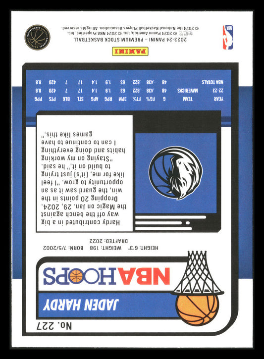 This is a nice example of a 2023-24 Hoops Premium Stock #227 Jaden Hardy Other important information about this card:In 2023 Jaden Hardy played for the Dallas Mavericks.Please check out...