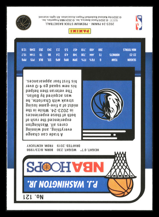 This is a nice example of a 2023-24 Hoops Premium Stock #121 PJ Washington Jr. Other important information about this card:In 2023 PJ Washington Jr. played for the Dallas Mavericks.Please...
