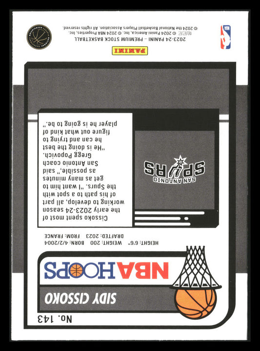 This is a nice example of a 2023-24 Hoops Premium Stock #143 Sidy Cissoko Other important information about this card:RCIn 2023 Sidy Cissoko played for the San Antonio Spurs.Please check...