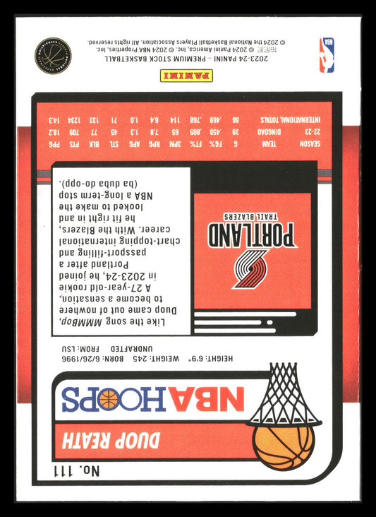 This is a nice example of a 2023-24 Hoops Premium Stock #111 Duop Reath Other important information about this card:RCIn 2023 Duop Reath played for the Portland Trail Blazers.Please check...