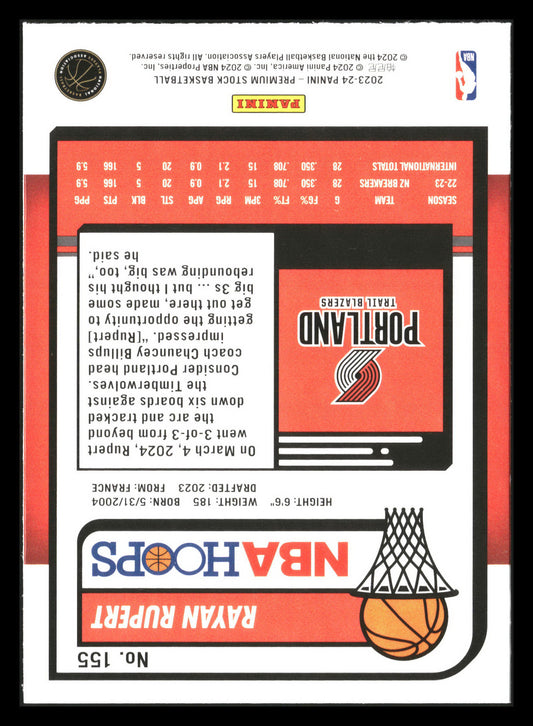 This is a nice example of a 2023-24 Hoops Premium Stock #155 Rayan Rupert Other important information about this card:RCIn 2023 Rayan Rupert played for the Portland Trail Blazers.Please check...