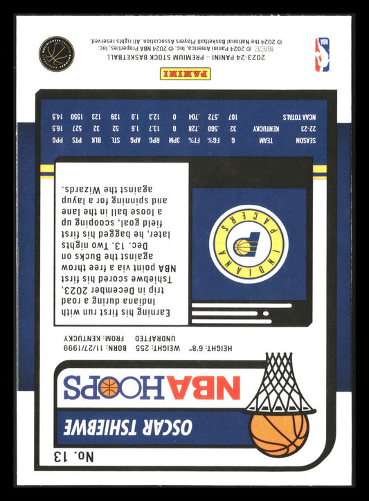 This is a nice example of a 2023-24 Hoops Premium Stock #13 Oscar Tshiebwe Other important information about this card:RCIn 2023 Oscar Tshiebwe played for the Indiana Pacers.Please check out...
