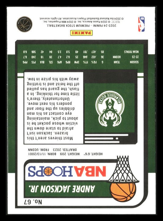 This is a nice example of a 2023-24 Hoops Premium Stock #67 Andre Jackson Jr. Other important information about this card:RCIn 2023 Andre Jackson Jr. played for the Milwaukee Bucks.Please...