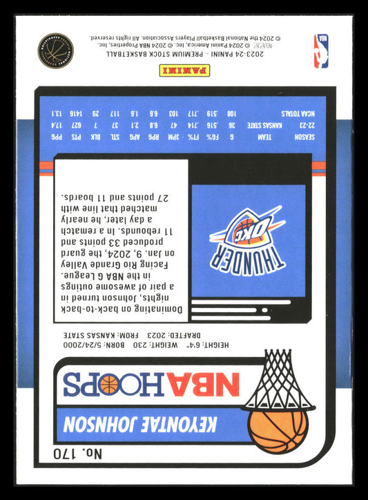 This is a nice example of a 2023-24 Hoops Premium Stock #170 Keyontae Johnson Other important information about this card:RCIn 2023 Keyontae Johnson played for the Oklahoma City Thunder.Please check...