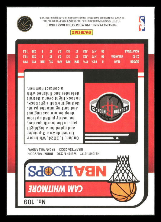 This is a nice example of a 2023-24 Hoops Premium Stock #109 Cam Whitmore Other important information about this card:RCIn 2023 Cam Whitmore played for the Houston Rockets.Please check out...