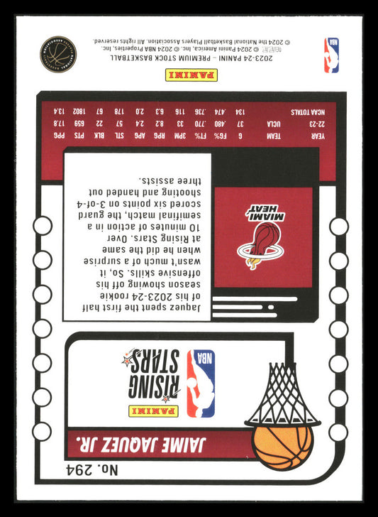 This is a nice example of a 2023-24 Hoops Premium Stock #294 Jaime Jaquez Jr. Other important information about this card:In 2023 Jaime Jaquez Jr. played for the Miami Heat.Please...