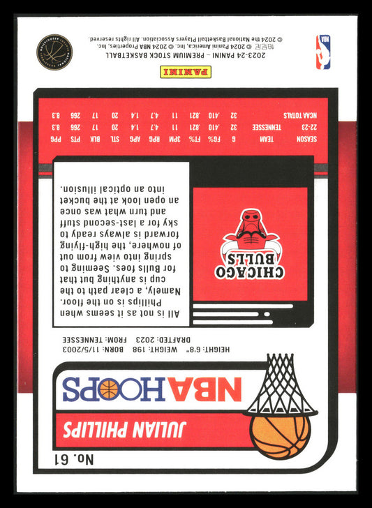 This is a nice example of a 2023-24 Hoops Premium Stock #61 Julian Phillips Other important information about this card:RCIn 2023 Julian Phillips played for the Chicago Bulls.Please check out...
