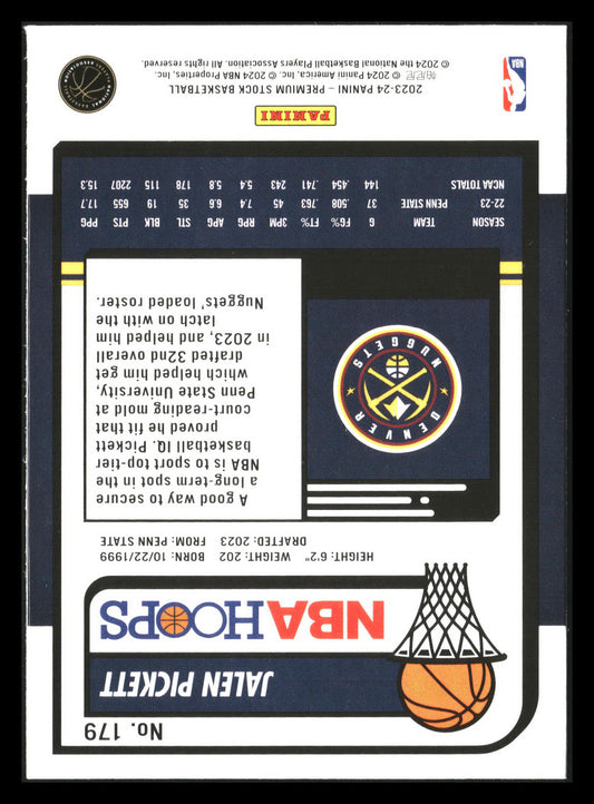 This is a nice example of a 2023-24 Hoops Premium Stock #179 Jalen Pickett Other important information about this card:RCIn 2023 Jalen Pickett played for the Denver Nuggets.Please check out...