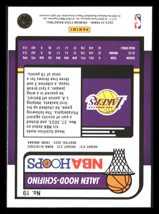 This is a nice example of a 2023-24 Hoops Premium Stock #19 Jalen Hood-Schifino Other important information about this card:RCIn 2023 Jalen Hood-Schifino played for the Los Angeles Lakers.Please check...