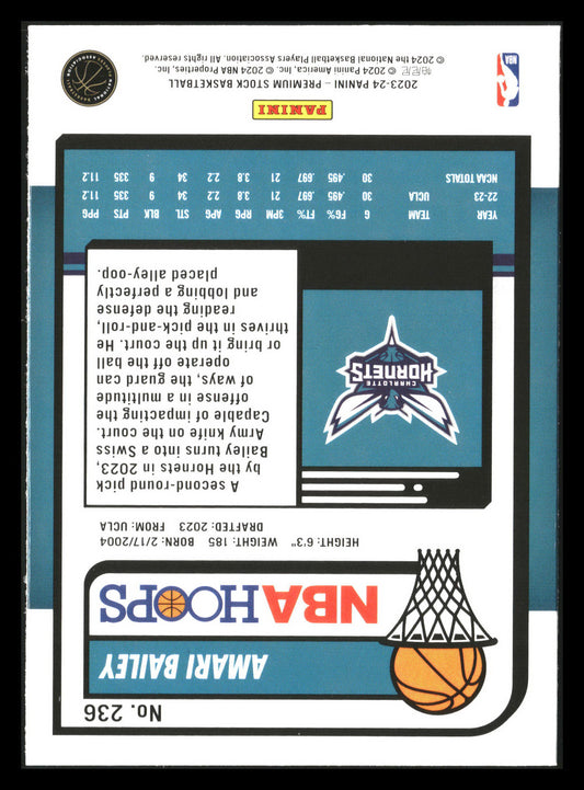 This is a nice example of a 2023-24 Hoops Premium Stock #236 Amari Bailey Other important information about this card:RCIn 2023 Amari Bailey played for the Charlotte Hornets.Please check out...