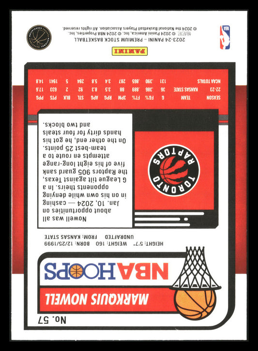 This is a nice example of a 2023-24 Hoops Premium Stock #57 Markquis Nowell Other important information about this card:RCIn 2023 Markquis Nowell played for the Toronto Raptors.Please check out...