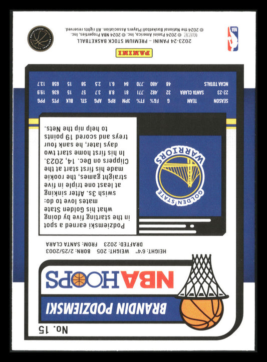 This is a nice example of a 2023-24 Hoops Premium Stock #15 Brandin Podziemski Other important information about this card:RCIn 2023 Brandin Podziemski played for the Golden State Warriors.Please check...