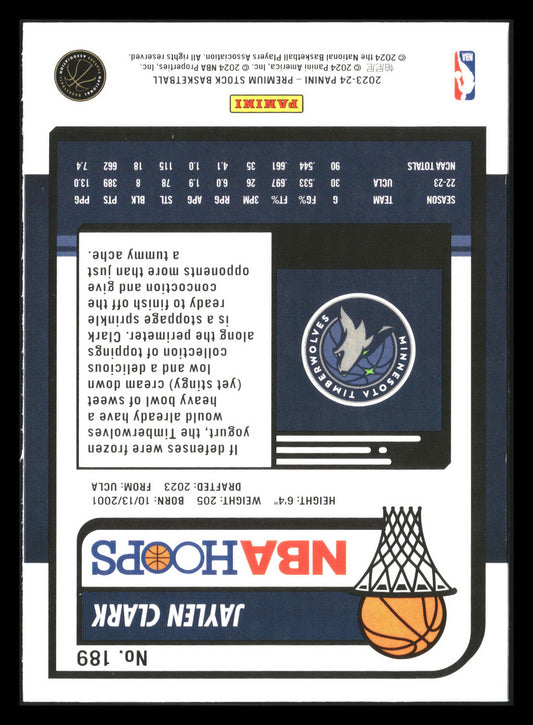 This is a nice example of a 2023-24 Hoops Premium Stock #189 Jaylen Clark Other important information about this card:RCIn 2023 Jaylen Clark played for the Minnesota Timberwolves.Please check out...