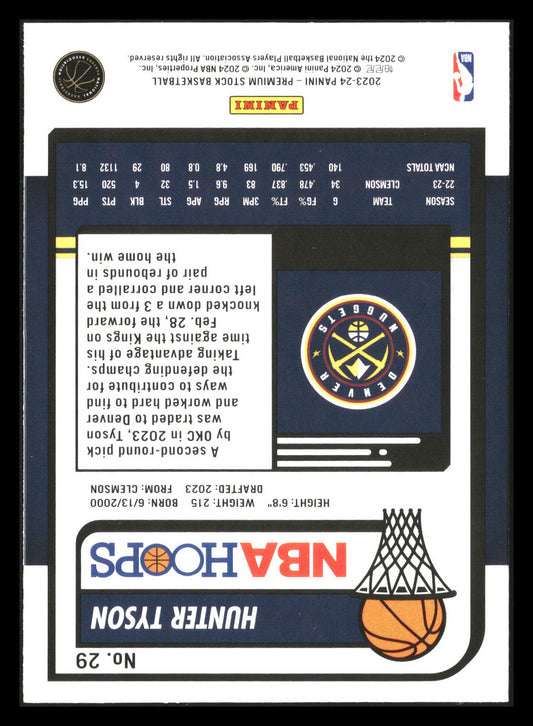 This is a nice example of a 2023-24 Hoops Premium Stock #29 Hunter Tyson Other important information about this card:RCIn 2023 Hunter Tyson played for the Denver Nuggets.Please check out...