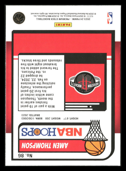 This is a nice example of a 2023-24 Hoops Premium Stock #86 Amen Thompson Other important information about this card:RCIn 2023 Amen Thompson played for the Houston Rockets.Please check out...