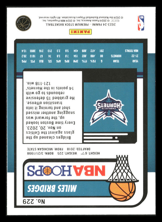 This is a nice example of a 2023-24 Hoops Premium Stock #229 Miles Bridges Other important information about this card:In 2023 Miles Bridges played for the Charlotte Hornets.Please check out...