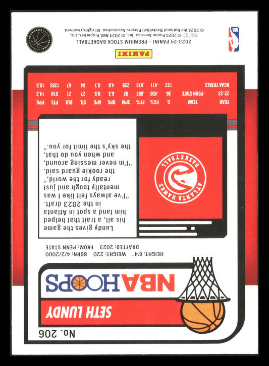 This is a nice example of a 2023-24 Hoops Premium Stock #206 Seth Lundy Other important information about this card:RCIn 2023 Seth Lundy played for the Atlanta Hawks.Please check out...