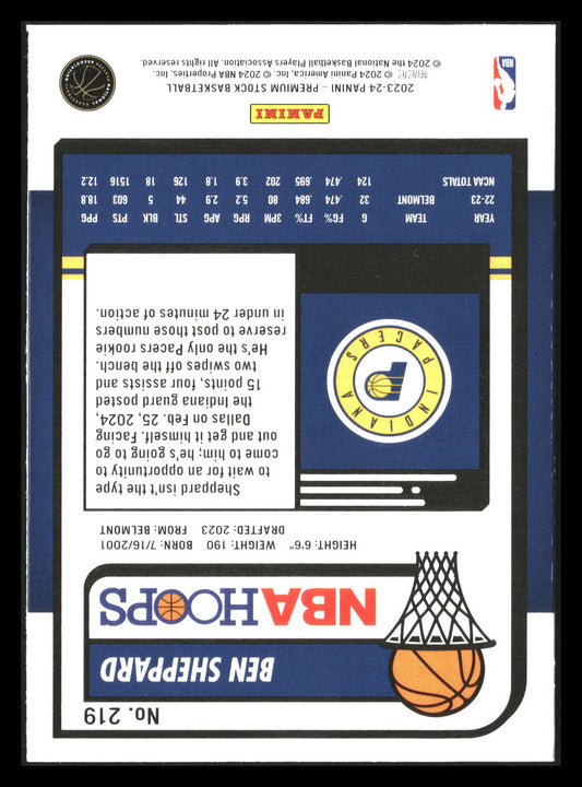 This is a nice example of a 2023-24 Hoops Premium Stock #219 Ben Sheppard Other important information about this card:RCIn 2023 Ben Sheppard played for the Indiana Pacers.Please check out...