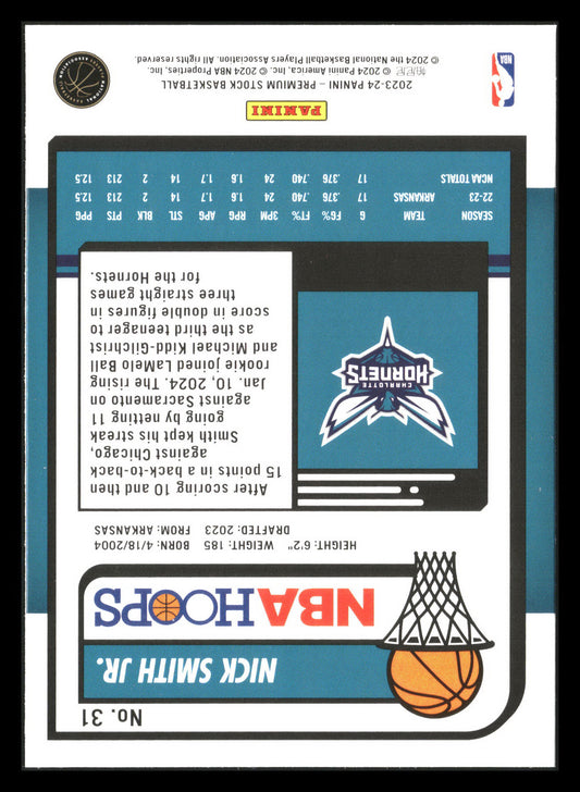 This is a nice example of a 2023-24 Hoops Premium Stock #31 Nick Smith Jr. Other important information about this card:RCIn 2023 Nick Smith Jr. played for the Charlotte Hornets.Please...