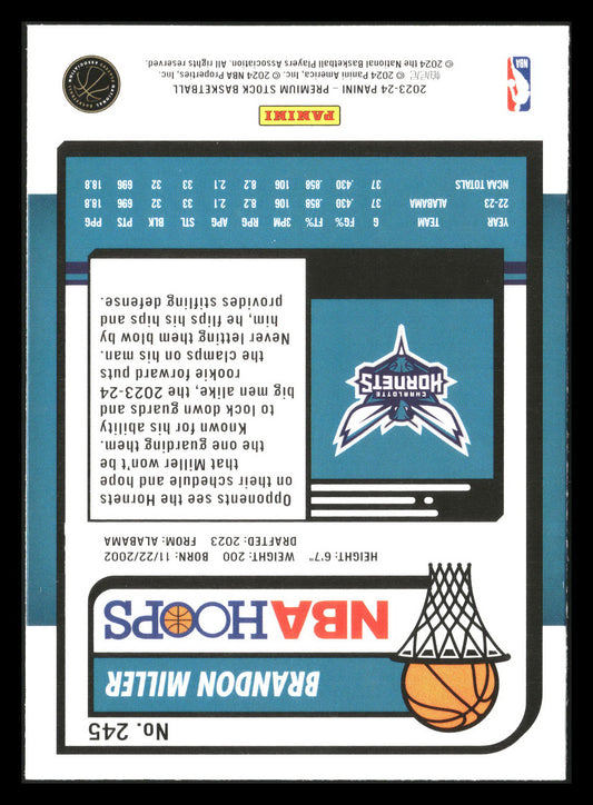 This is a nice example of a 2023-24 Hoops Premium Stock #245 Brandon Miller Other important information about this card:RCIn 2023 Brandon Miller played for the Charlotte Hornets.Please check out...
