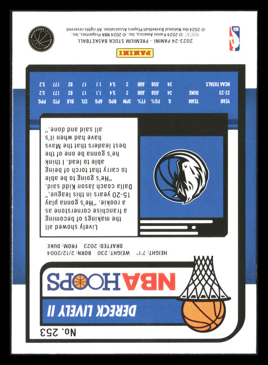 This is a nice example of a 2023-24 Hoops Premium Stock #253 Dereck Lively II Other important information about this card:RCIn 2023 Dereck Lively II played for the Dallas Mavericks.Please...