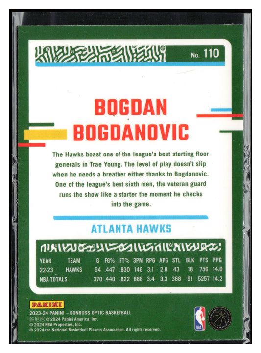 This is a nice example of a 2023-24 Donruss Optic #110 Bogdan Bogdanovic Other important information about this card:In 2023 Bogdan Bogdanovic played for the Atlanta Hawks.Please check out our...