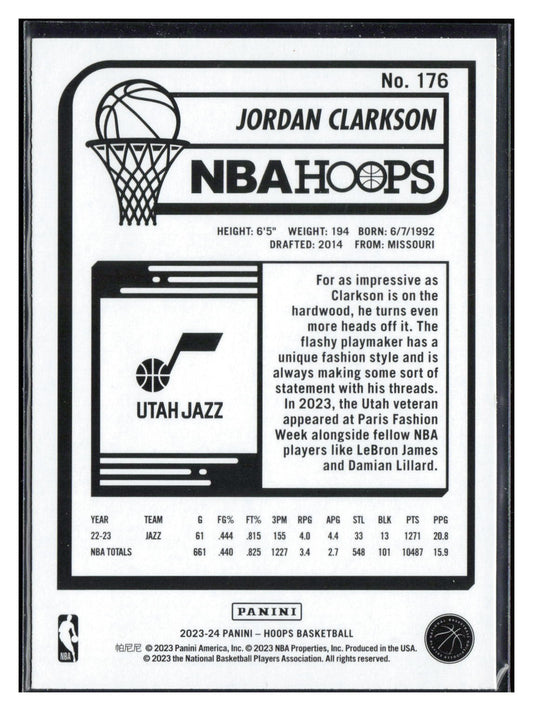 This is a nice example of a 2023-24 Hoops #176 Jordan Clarkson Other important information about this card:In 2023 Jordan Clarkson played for the Utah Jazz.Please check out our other...