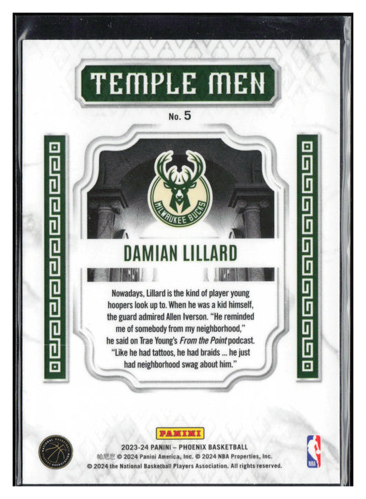 This is a nice example of a 2023-24 Panini Phoenix #5 Damian Lillard Temple Men Other important information about this card:In 2023 Damian Lillard played for the Milwaukee Bucks.Please check...