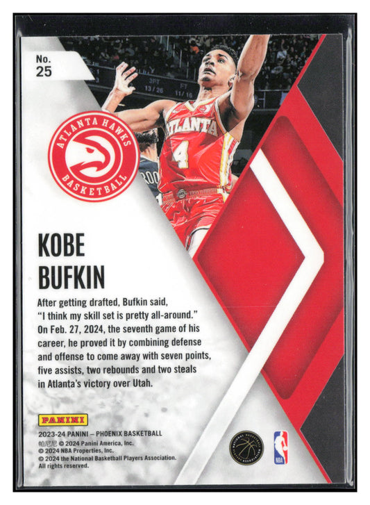 This is a nice example of a 2023-24 Panini Phoenix #25 Kobe Bufkin Instant Phenom Other important information about this card:In 2023 Kobe Bufkin played for the Atlanta Hawks.Please check...