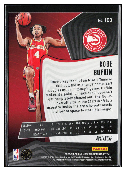 This is a nice example of a 2023-24 Panini Revolution #103 Kobe Bufkin Avalanche Other important information about this card:RCIn 2023 Kobe Bufkin played for the Atlanta Hawks.Please check out...