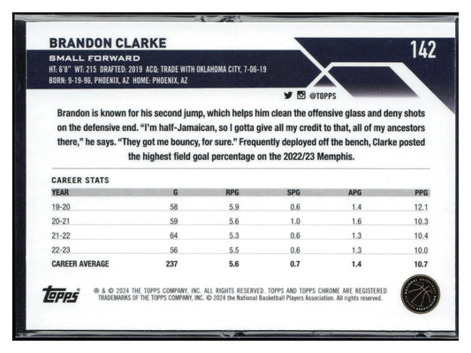 This is a nice example of a 2023-24 Topps Chrome #142 Brandon Clarke Blue Basketball Refractors Other important information about this card:In 2023 Brandon Clarke played for the Memphis Grizzlies.Please...