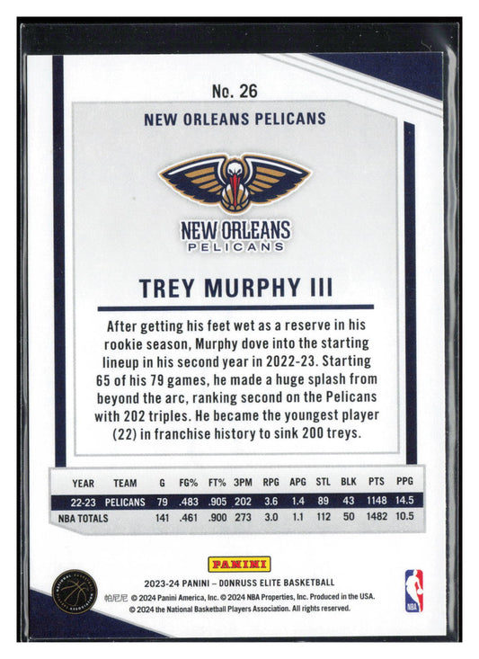 This is a nice example of a 2023-24 Donruss Elite #26 Trey Murphy III Orange Other important information about this card:In 2023 Trey Murphy III played for the New Orleans...
