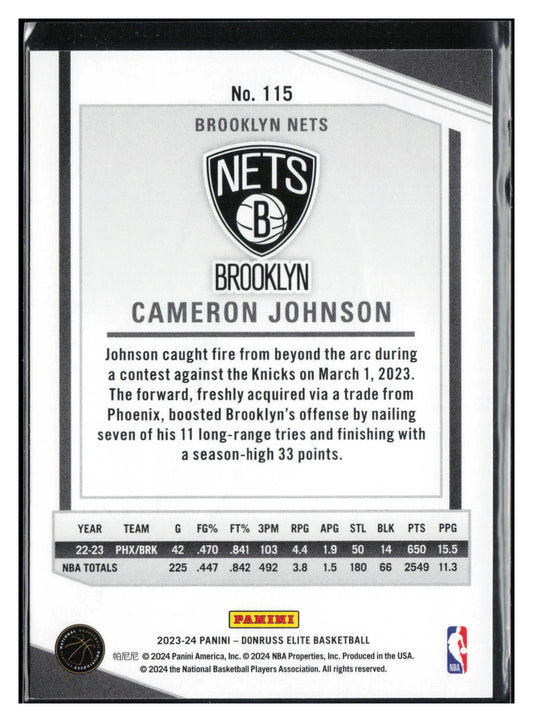 This is a nice example of a 2023-24 Donruss Elite #115 Cameron Johnson Orange Other important information about this card:In 2023 Cameron Johnson played for the Brooklyn Nets.Please check out...