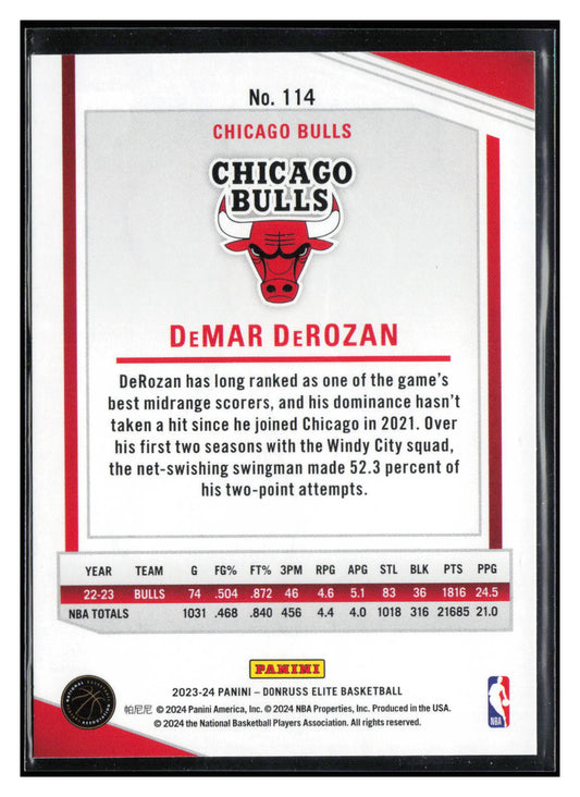 This is a nice example of a 2023-24 Donruss Elite #114 DeMar DeRozan Orange Other important information about this card:In 2023 DeMar DeRozan played for the Chicago Bulls.Please check out...
