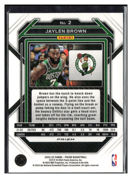 This is a nice example of a 2022-23 Panini Prizm #2 Jaylen Brown Prizms Ice Other important information about this card:In 2022 Jaylen Brown played for the Boston Celtics.Please check...