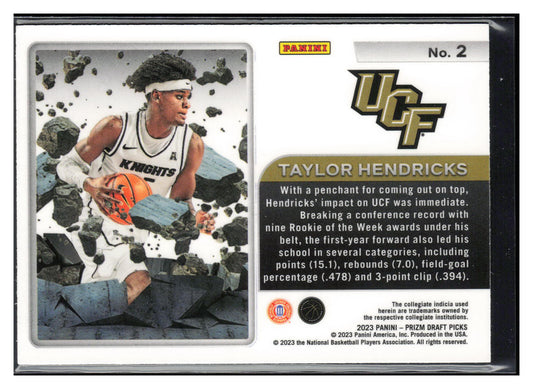 This is a nice example of a 2023 Panini Prizm Draft Picks #2 Taylor Hendricks Prizm Break Other important information about this card:In 2023 Taylor Hendricks played for the Central...