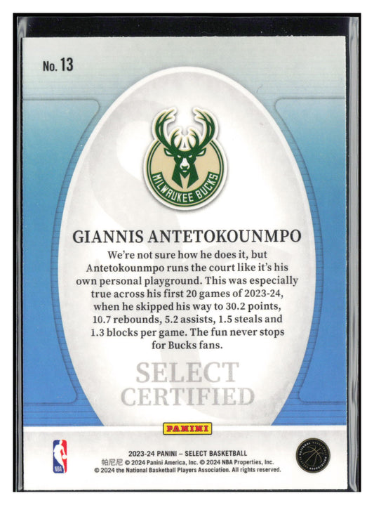 This is a nice example of a 2023-24 Panini Select #13 Giannis Antetokounmpo Select Certified Other important information about this card:In 2023 Giannis Antetokounmpo played for the Milwaukee Bucks.Please check...