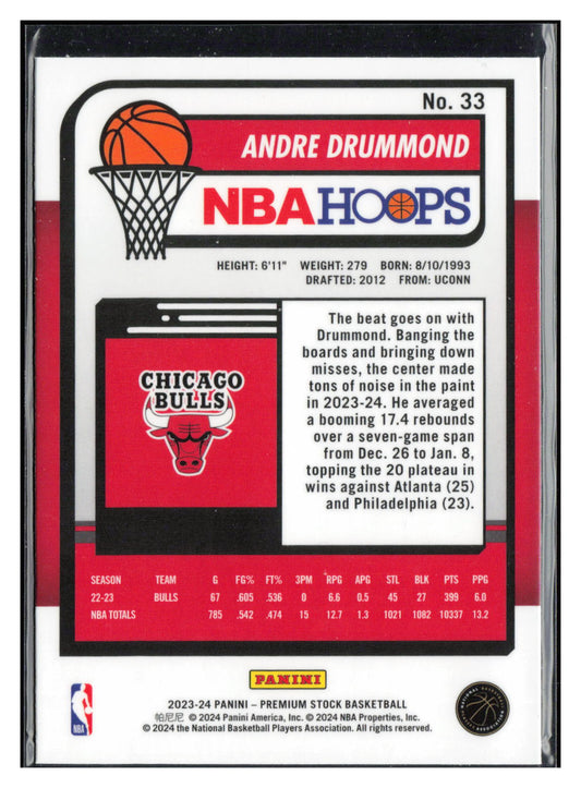 This is a nice example of a 2023-24 Hoops Premium Stock #33 Andre Drummond Other important information about this card:In 2023 Andre Drummond played for the Chicago Bulls.Please check out...