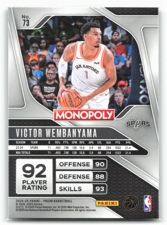 This is a nice example of a 2024-25 Panini Prizm Monopoly #73 Victor Wembanyama Other important information about this card:In 2024 Victor Wembanyama played for the San Antonio Spurs.Please check...