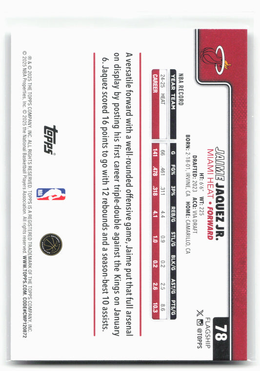This is a nice example of a 2025-26 Topps #78 Jaime Jaquez Jr. Season Tip Off Other important information about this card:26257In 2025 Jaime Jaquez Jr. played for the Miami...