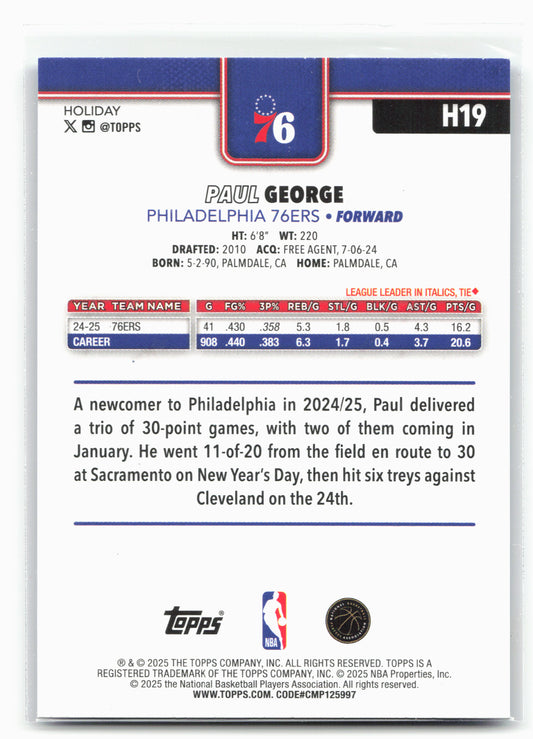 This is a nice example of a 2025-26 Topps Holiday #H19 Paul George Blue Metallic Glitter Holiday Other important information about this card:26261In 2025 Paul George played for the Philadelphia...