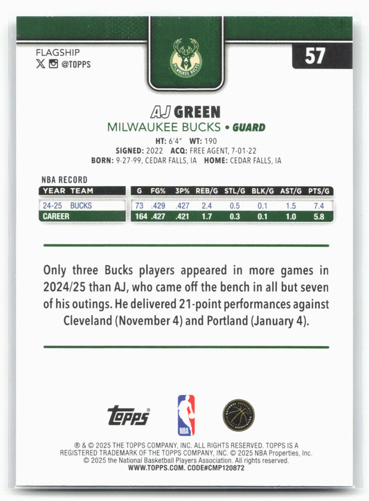 This is a nice example of a 2025-26 Topps #57 AJ Green Season Tip Off Other important information about this card:26263In 2025 AJ Green played for the Milwaukee Bucks.Please check...